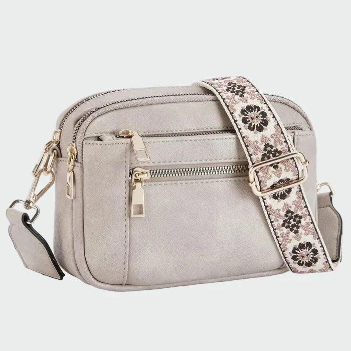Elegantní kabelka přes rameno v černé barvě s moderním a praktickým designem. Disponuje dvěma vnějšími zipy s kovovými detaily ve zlaté barvě, které přidávají na luxusu a funkčnosti. Široký textilní popruh s působivým vzorem dodává jedinečný charakter a pohodlí při nošení. Ideální pro každodenní použití, ale i pro výjimečné příležitosti.