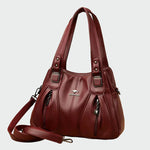 Impozantní dámská taška přes rameno v hluboké bordó barvě, navržená tak, aby poskytovala eleganci a pohodlí při každém vašem vzhledu. Vyrobena z odolné kvalitní umělé kůže, vyniká moderním designem a elegantními detaily na přední straně. Dvě dlouhé ucha umožňují pohodlné nošení na rameni, zatímco odnímatelný popruh nabízí možnost nosit ji i jako crossbody. Vnější kapsy se zipem poskytují praktičnost a snadný přístup k nezbytnostem.