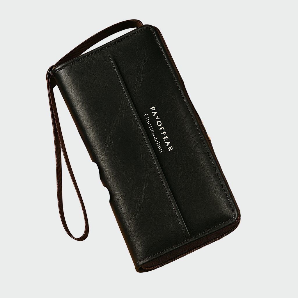 Elegantní pánská peněženka v černé barvě s minimalistickým designem a praktickým zápěstním páskem pro snadné nošení. Má více přihrádek na karty, hotovost a mince, což zajišťuje pohodlí a organizaci v každodenním životě. Kvalitní textura kůže a decentní logo na přední straně dodávají moderní a rafinovaný nádech. Doplněk, který spojuje styl a funkčnost.