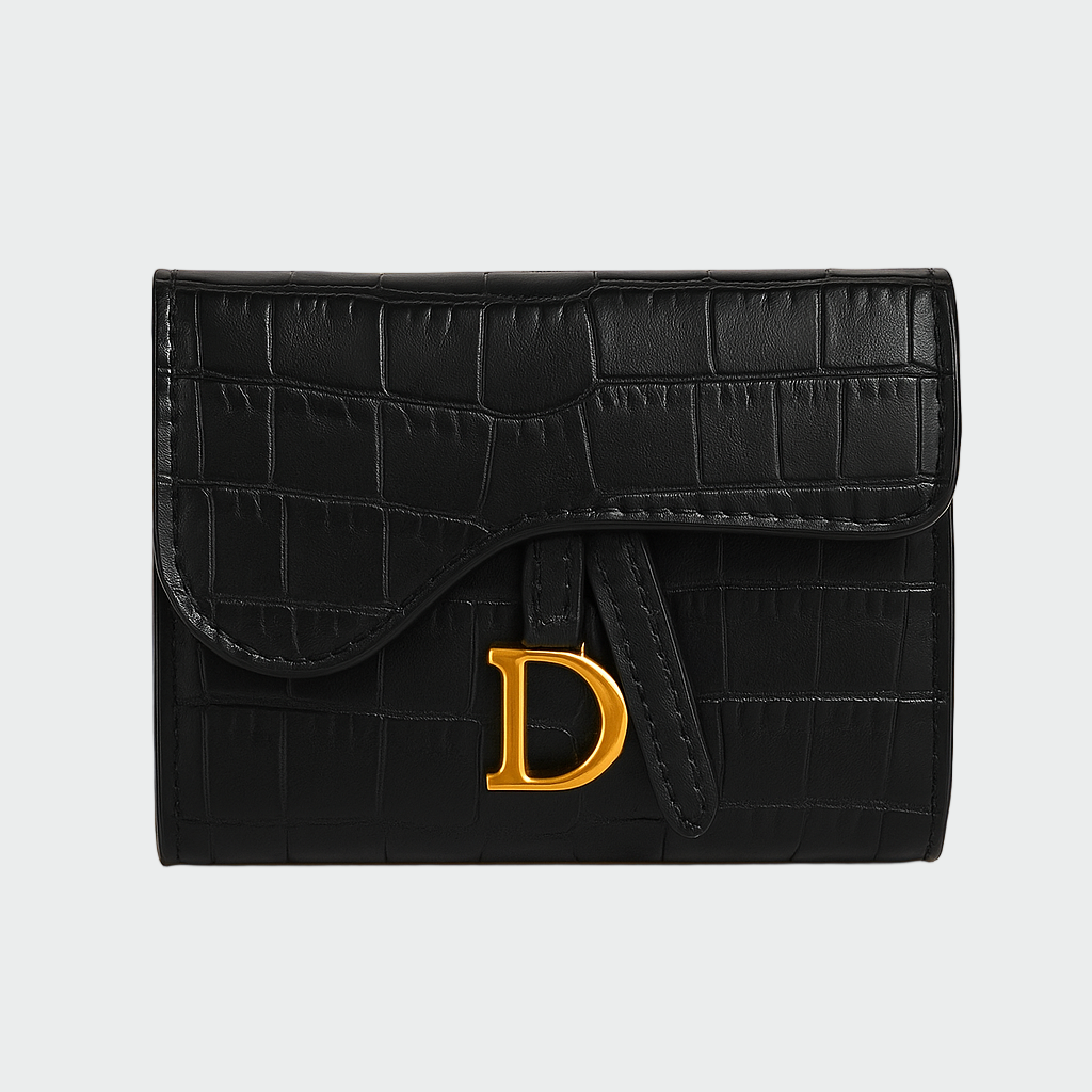 Elegantní peněženka v černé barvě s reliéfní texturou, která připomíná krokodýlí kůži. Moderní design doplňuje charakteristické kovové zapínání ve zlaté barvě, což dodává pocit luxusu a stylu. Disponuje praktickým vnitřním uspořádáním pro bezpečnou organizaci karet, hotovosti a drobných předmětů. Doplňěk, který spojuje pohodlí, praktičnost a eleganci, ideální pro každou příležitost.