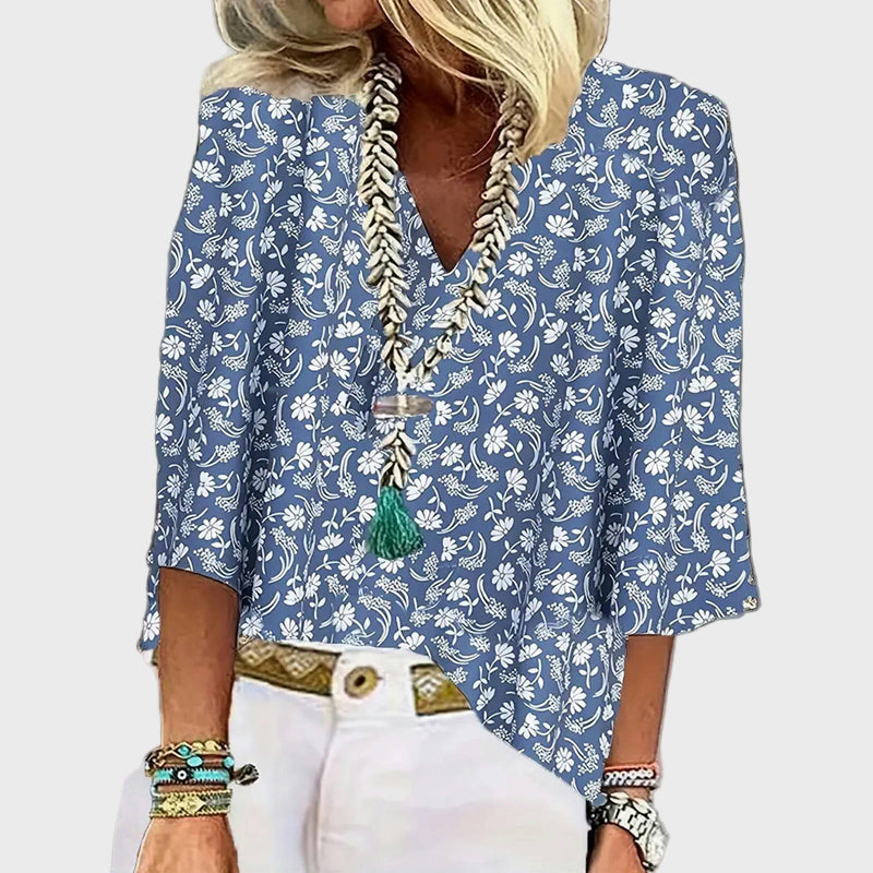 Osvěžte svůj každodenní outfit s touto blůzou v modré barvě, zdobenou malými bílými květinovými vzory. Její klasický design s tříčtvrtečními rukávy poskytuje pohodlí a eleganci, zatímco volný střih ji činí ideální volbou pro všechny denní příležitosti.