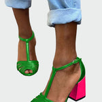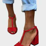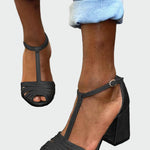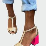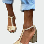 Tyto zlaté sandály s T-páskem kombinují eleganci a stabilitu, přičemž dodávají jiskřivý nádech každému vašemu vzhledu. Design s křížovými pásky obepíná nohu, zatímco široký podpatek poskytuje pohodlí a bezpečnost při chůzi. Pár, který se ideálně hodí na večerní výlety i na zvláštní příležitosti.