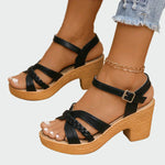 Moderní černé sandály s platformou a podpatkem, ideální pro každodenní stylové a pohodlné nošení. Kombinace pleteného pásku na přední části s klasickými liniemi dodává eleganci, zatímco hnědá korková podrážka přináší letní pocit.