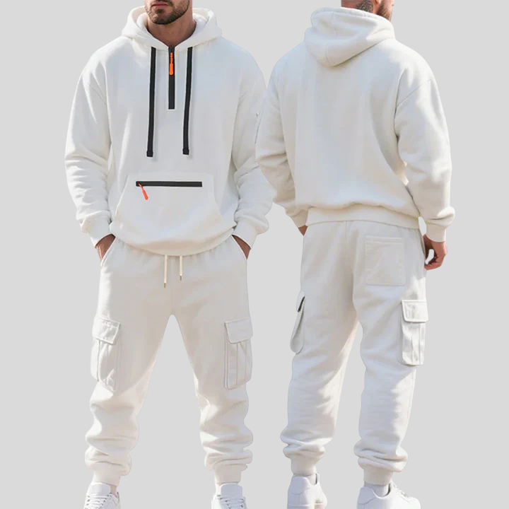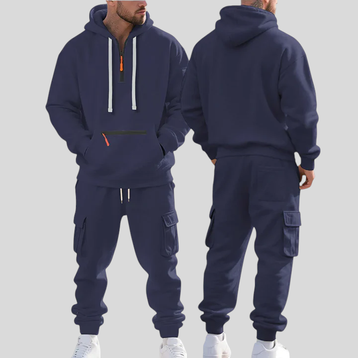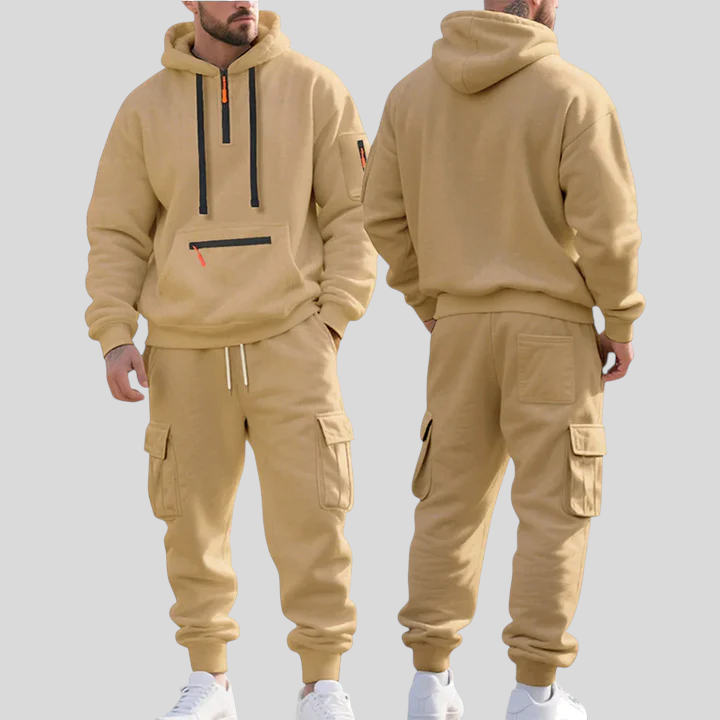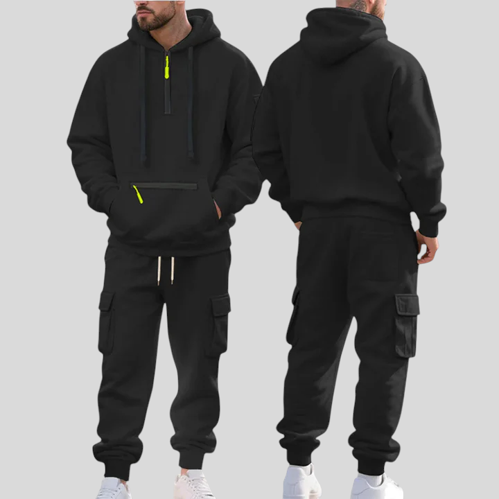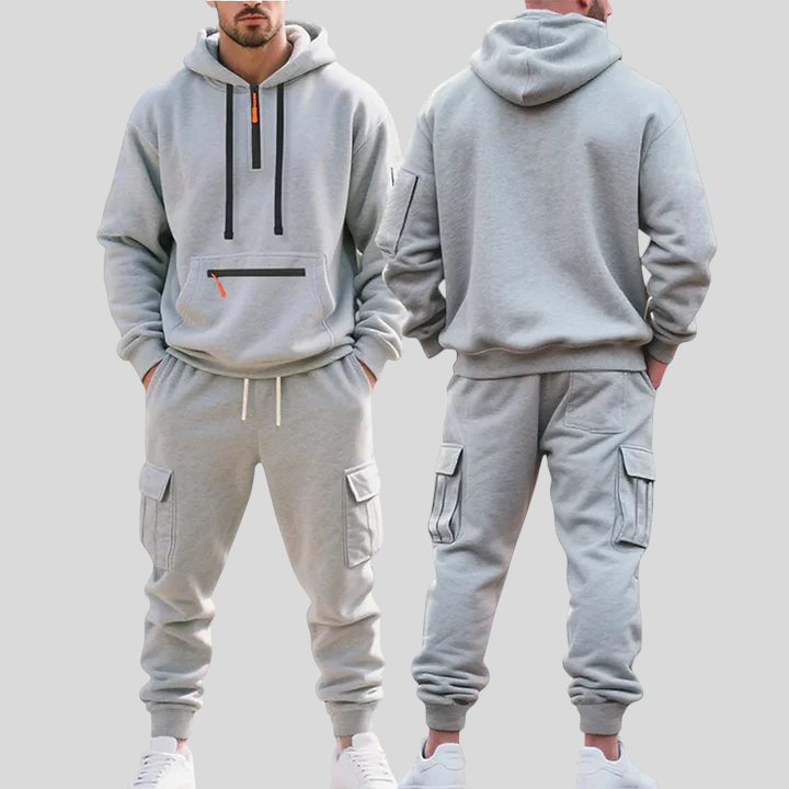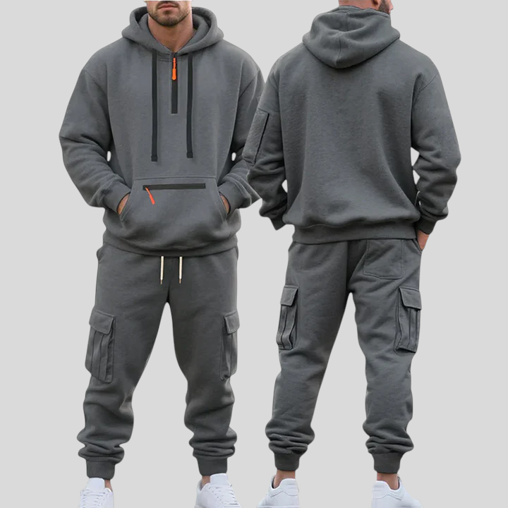 Tato zimní pánská souprava je vytvořená pro ty, kteří chtějí maximální pohodlí bez kompromisů ve stylu. Mikina s kapucí a zipem u hrudi působí moderně a prakticky, zatímco cargo kalhoty s bočními kapsami dodávají městský a funkční vzhled. Ideální na každý den, cestování, procházky nebo odpočinek ve stylu – univerzální, hřejivá a velmi snadno nositelná souprava.