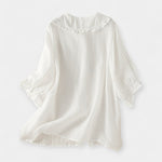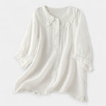 Hravá halenka z lehké směsi bavlny a lnu, která spojuje eleganci a pohodlí. Límec Peter Pan s volánky přidává jedinečný detail, který povyšuje každý ležérní vzhled, ideální pro sukně nebo kalhoty.