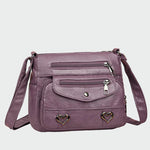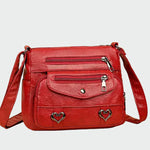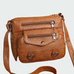 Vintage crossbody taška v hnědé barvě s měkkou texturou a romantickými detaily. Disponuje několika vnějšími kapsami se zipem, které nabízejí praktičnost, zatímco kovové prvky ve tvaru srdce dodávají jedinečný charakter. Nastavitelný popruh umožňuje pohodlné nošení, což z ní činí ideální volbu pro každodenní outfity se zvláštním stylem.